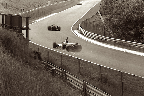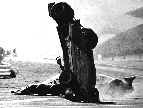 Japon, 1977 : Gilles Villeneuve à son époque « Air Canada », renverse sa McLaren après avoir heurté la Tyrell P34 à six roues de Ronnie Peterson.