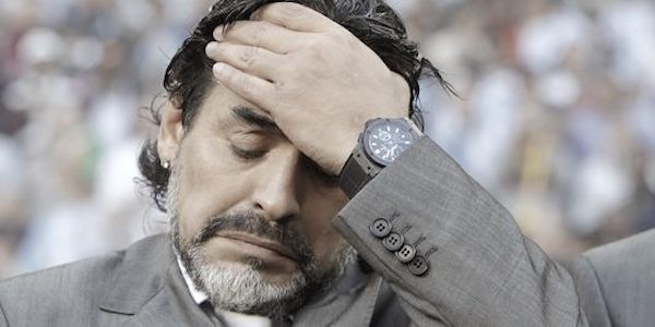 Diego Maradona, dépité après la défaite de sa sélection face à l’Allemagne en 2010. A noter à son poignet, une Hublot Big Bang spécialement réalisée en son honneur.