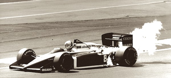 Andrea de Cesaris avait tendance à maltraiter ses machines qui finissaient le plus souvent bonnes pour la casse. Ici, c’est sa Brabham BT56 qui prend feu. © Daily Mail