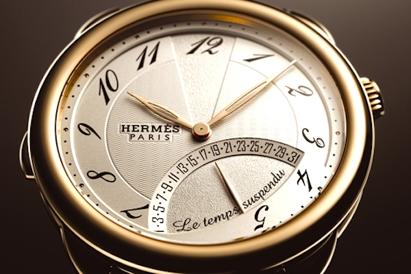 L’élégant dessin de la Hermès Arceau Le temps suspendu, savamment agrémenté d’un calendrier rétrograde, invite à s’extirper des contraintes temporelles.