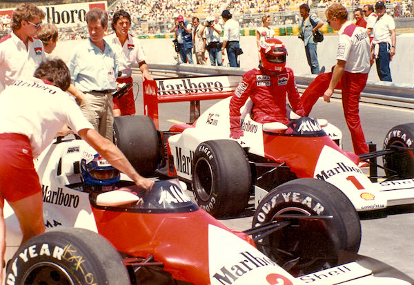 Alain Prost et Niki Lauda à bord de leur McLaren MP4/2B, lors de la saison 1985, la dernière de l’autrichien en Formule 1. Les deux hommes ont noué une réelle complicité du fait de leur approche chirurgicale de la course. Il est d’ailleurs intéressant d’observer que le pilote français est allé jusqu’à imiter son mentor en remportant un dernier titre (en 1993) au sortir d’une première retraite.
