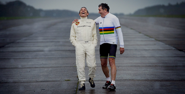 Les deux hommes réunis avec leurs machines favorites. Jacky Ickx se tient dans le cockpit de la Porsche 936 avec laquelle il a remporté les 24 Heures du Mans 1977 (en compagnie de Jürgen Barth et Hurley Haywood), réalisant alors une performance individuelle hors norme. Bien qu’il ait suffisamment insisté sur la dimension collective d’une telle victoire en rappelant notamment que « Les palmarès se construisent sur la passion (…) partagée dans un écurie », il puisa cette fois-là au plus loin de ses capacités en avalant quasiment seul la nuit mancelle (il couvrit quatorze heures de la course !). Une victoire herculéenne qui n’est pas sans rappeler celle de 1969 qui, au terme d’un duel épique avec Hans Herrmann sur 908, vit le belge et son coéquipier Jackie Oliver, sur Ford GT40, remporter la plus disputée des victoires au Mans de l’Histoire (120 mètres d’écart entre le premier et le deuxième !) ; le tout après être parti en dernier position, Ickx ayant à sa manière entendu manifester son opposition au départ « type Le Mans ».