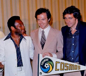 La légende de Franz Beckenbauer s’est notamment façonnée lors de la Coupe du Monde 1970, au cours de laquelle il termina la 1/2 finale d’anthologie perdue par la RFA face à l’Italie le bras en écharpe par suite d’une fracture de la clavicule… / Comme bon nombre de grands joueurs ayant ouvert la voie aux destinations exotiques, l’allemand a vécu son rêve américain en rejoignant les Cosmos de New-York dans les années 70, ici en compagnie de Pelé et Chinaglia. / L’expérience avortée de Beckenbauer sur le banc de touche de l’Olympique de Marseille entre 1990 et 1991 a été l’un des grands regrets de sa carrière ; il n’y avait pas de place pour deux empereurs sur les bords de la Canebière…